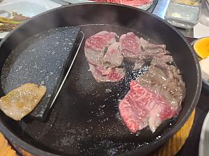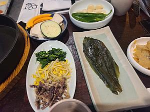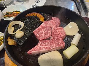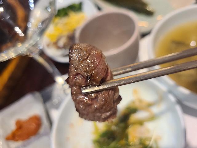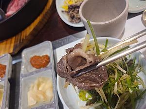 まずはチャドルバギという部位で、肋間の霜降りを注文!薄切りなのでとても食べやすく食感もよく、霜降りですが和牛ほどではなくほどよい霜降りなので脂っこさがなく、胃もたれしません!また、食べるときには韓国式に、ナムルとよばれる3種の野菜の和え物や、酢漬けの野菜などとともに食べるとより一層お肉のおいしさが引き立ちますよ!また、パジョリとよばれる生のネギを甘辛く和えたものと一緒に食べるのが通の食べ方!お肉とよく合いますよ!
