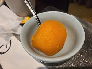 最後のシメには鉄板ビビンバという、あえて鉄板にご飯を押し付けておこげをつけてカリっとした食感で食べるメニュー!こちらは店員さんが作ってくれますよ!最後に真ん中に卵を割って完成!卵も混ぜて食べてくださいね!ほんの少し辛い程度ですので、辛いのが苦手な方でもおいしく食べられますよ!一緒に韓国味噌汁が出てきます。日本のお味噌とは違った風味を楽しんでくださいね!また、食後のデザートにはホンシとよばれる熟れた柿のアイスが。旬の果物が準備されているようですね!